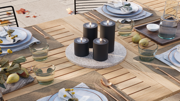 For et roligt helhedsindtryk kan du samle lysene på et fad og variere højderne, mens farverne holdes i samme palette.