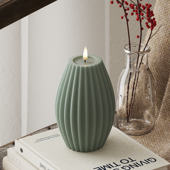 This beautiful LED Ribbed candle in Sage Green is created with our special Wetlook ™ surface that makes it look like a real candle. The surface looks exactly like the top of a candle that has been on, giving a very special authentic feeling. With a height of 400 cm, it fits perfectly into most homes, where it spreads coziness and warmth with its natural appearance.